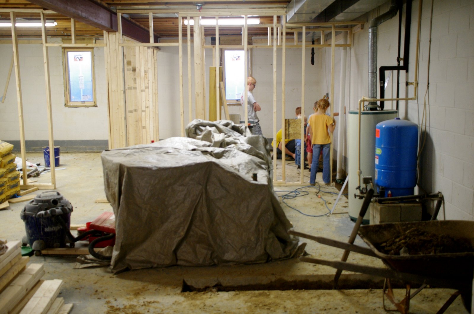 One day after pouring concrete back into the gaps in our basement, we had to turn the water off, so when the rain started pouring down Brett and all the kids ran out and showered in the rain so they would be clean the next morning for church.
